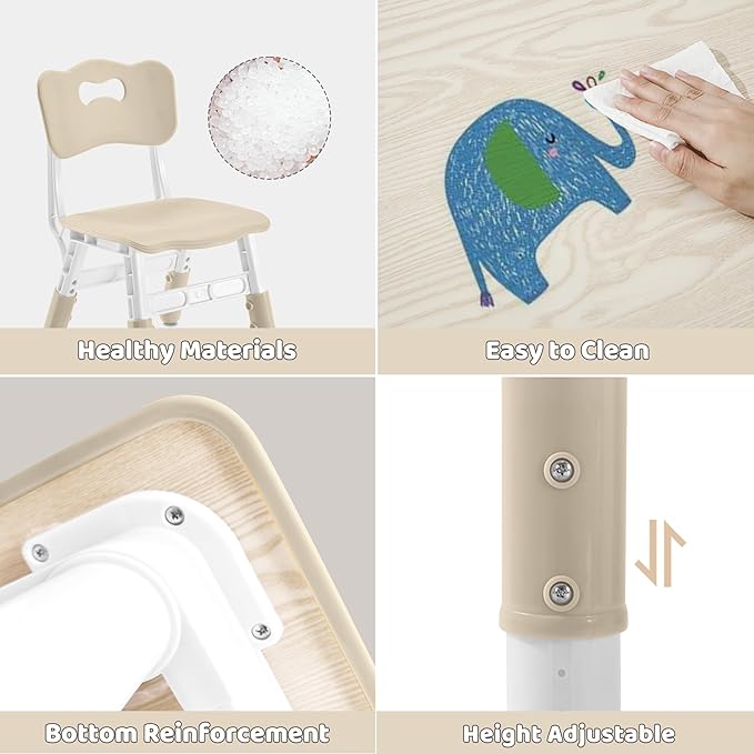 - 1 ✨ 【Height-Adjustable Design】 Table: Features 7 adjustable height levels from 17.7” to 21.65”, accommodating children from ages 3 to 8. Chairs: 4 chairs with 3 adjustable height settings (10.6” to 12.2”) ensure a perfect fit for growing kids.