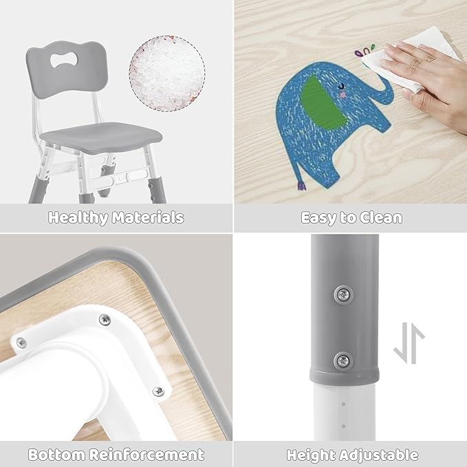 - 1 ✨ 【Height-Adjustable Design】 Table: Features 7 adjustable height levels from 17.7” to 21.65”, accommodating children from ages 3 to 8. Chairs: 4 chairs with 3 adjustable height settings (10.6” to 12.2”) ensure a perfect fit for growing kids.