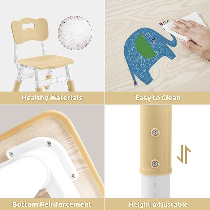 - 1 ✨ 【Height-Adjustable Design】 Table: Features 7 adjustable height levels from 17.7” to 21.65”, accommodating children from ages 3 to 8. Chairs: 4 chairs with 3 adjustable height settings (10.6” to 12.2”) ensure a perfect fit for growing kids.