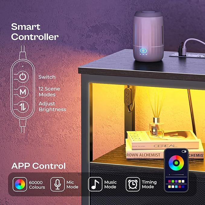 - 【Nightlight and Room Ambiance】With a smart controller, choose from 12 scene modes, 5 adjustable speed levels, and 3 brightness settings or smartphone app with over 60,000 colors, set timers, music and mic mode. Whether you need a gentle nightlight or want to create the perfect mood, this LED nightstand’s LED lights offer versatile lighting options that give room just the right amount of light to sleep with