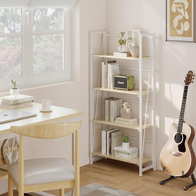 BHG Vintage Multifunctional Bookcase Folding Bookshelf, No-Assembly Plant Stand Storage Rack Shelves for Home Office (White, 4-Tier)