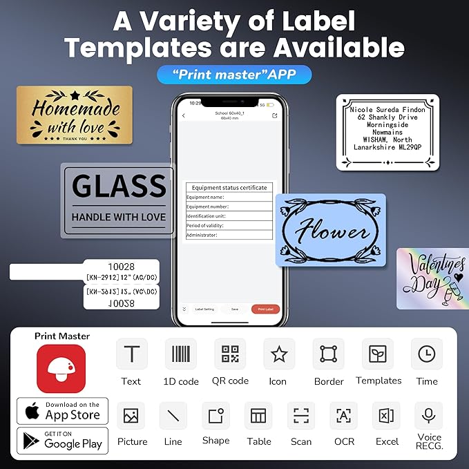 - Free Multifunctional App: The Phomemo M250 label maker printer comes with the powerful "Print Master" app. Create various content like QR codes, text, OCR, images, voice recognition, and batch printing. Choose from over 1500 symbols, 200+ templates, 110+ fonts, and 20+ languages for limitless customization options