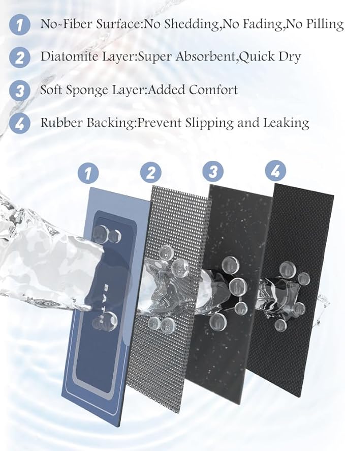- Innovative Soft Diatomaceous Earth Bath Mat: Experience the perfect blend of comfort, functionality, and innovation with our luxury bath rug. Bathroom floor mat features a smooth leather-like surface for easy maintenance, a cushioning sponge layer for added comfort, a super absorbent and quick-drying soft diatomaceous earth layer, and a durable rubber backing for added stability.