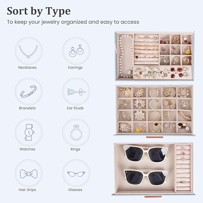 Dajasan Jewelry Organizer Box, Jewelry Storage Organizer with 2 Drawers, 3-Tier Large Jewelry Gift Box for Women, Girls, Friends, Wife or Mother, Gift Idea (Smoky Blue)