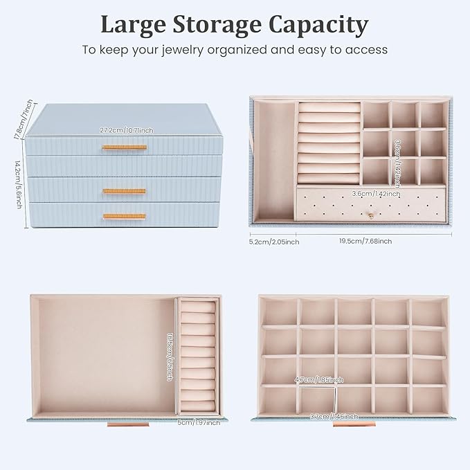 - Style Upgrade: Classic blue and gold, shiny metal buckles, neat stitching, and vertical texture on the sides make the jewelry holder box more classic and fashionable. The PU leather on the surface of the jewelry box organizer is waterproof and easy to clean, and the soft lining can effectively protect your jewelry