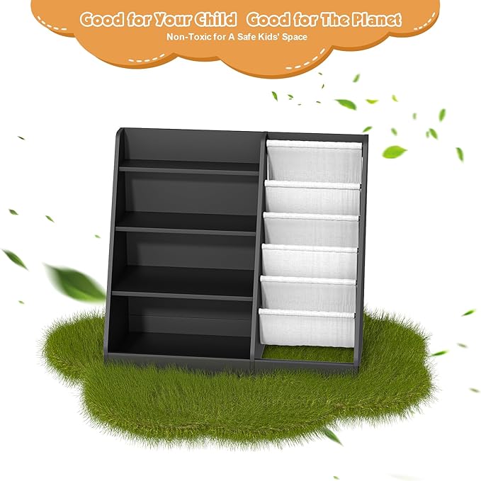 - Natural Eco-Friendly Material: Bookshelf organizer for kid is constructed with high quality particle board and cotton linen fabric. Holding heavy book without rip apart. Your kids keep away from chemical hazard. The loading bearing can hold maximum 66lbs. Kid-sized Book Rack with Round Corner: Kids room bookshelf is just right height for children to safely grab and put away their favorite books independently. The corner of book rack are round to protect kids from sharp edge in case of stumble.