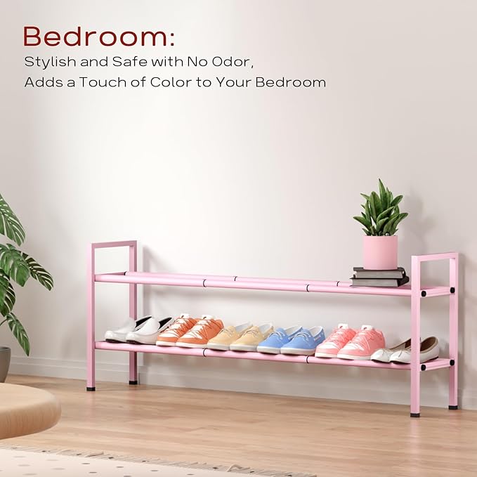 Bumusty 2-Tier Long Expandable Shoe Rack for Closet, 18"-44" Adjustable Shoe Rack for Entryway, 10-12 Pairs Large Shoe Organizer Shelf Storage, Sturdy Metal, Pink