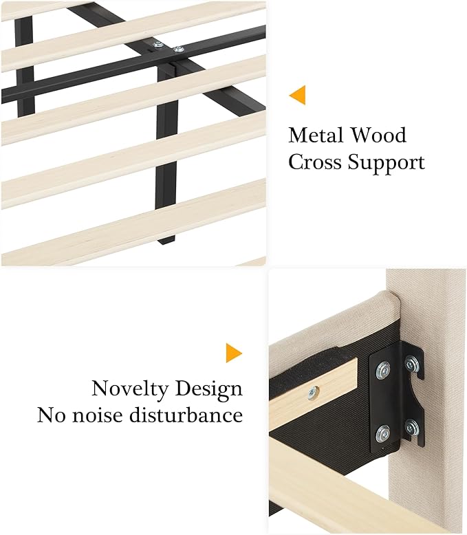 - 【Sturdy Upholstered Bed Frame】Built with a heavy-duty metal frame and supported by 12 solid wood slats, the bed frame provides a strong central "+" structure and supports up to 500 lbs. The solid wood legs are smooth and durable, preventing floor scratches.