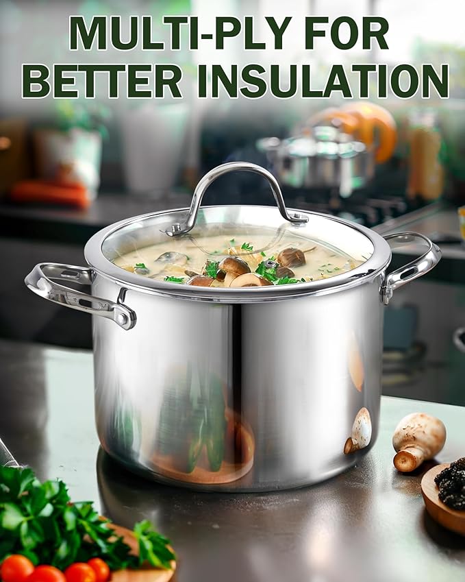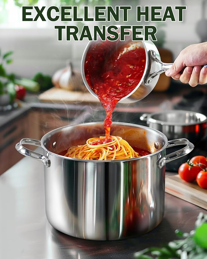 - Excellent Heat Distribution: Stainless steel cookware set features a three-layer composite structure to ensure even and rapid heat distribution; This design minimizes hot spots, prevents food from burning, and enhances cooking efficiency