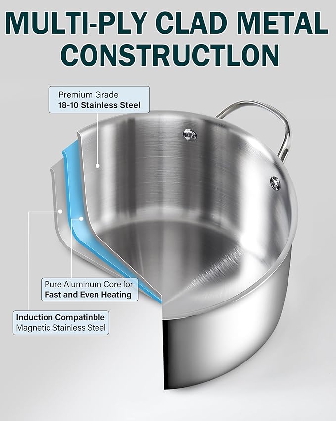 - Multi-Ply Clad: Pots and pans set features a combination of 18/10 stainless steel with multi-element aluminum core creates a permanent bond of metal, so heat pass through the whole pan body from bottom to side wall, not just bottom