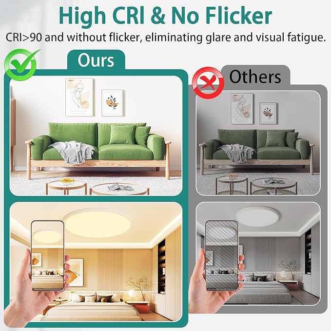 - High Color Rendering Index Eye Protection Light:Our LED ceiling light has higher light transmittance, the light is evenly and softly distributed in the room, ensuring a pleasant and non-glare light. It can protect eyes from strong light. CRI90+ rating for LED ceiling lights brings vivid and natural light, making the light closer to the true and original color of the object,not dimmable.