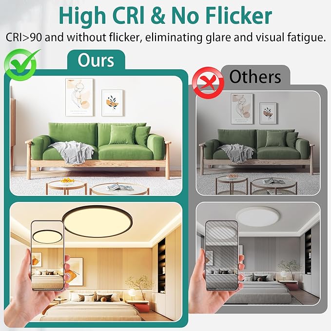 - High Color Rendering Index Eye Protection Light: Our LED ceiling light has higher light transmittance, the light is evenly and softly distributed in the room, ensuring a pleasant and non-glare light. It can protect eyes from strong light. CRI90+ rating for LED ceiling lights brings vivid and natural light, making the light closer to the true and original color of the object,not dimmable.