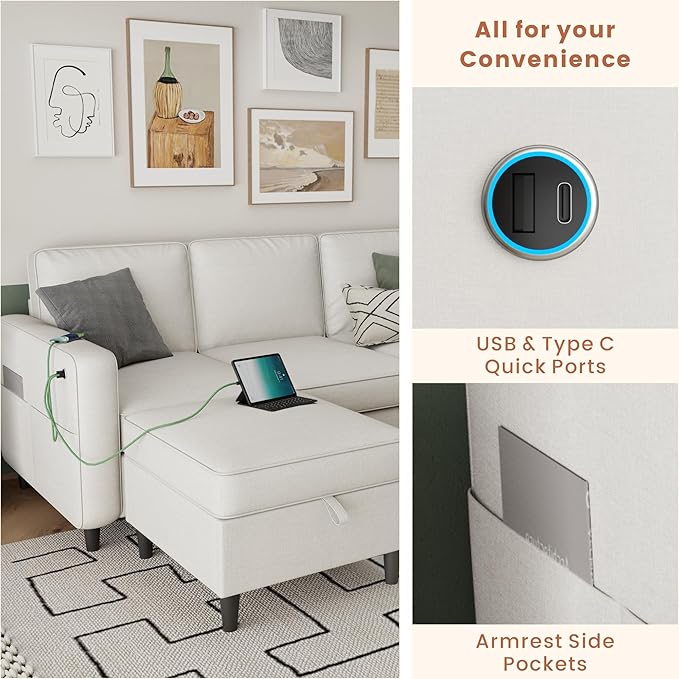 - 【All For Your Convenience】The sectional couch equipped with 1 USB and 1 Type-C quick charging ports, do not have to worry about the phone and tablet computer at the same time no power. The side pockets on the armrest allow you to easily reach and grab whatever you need, making the space more neat.