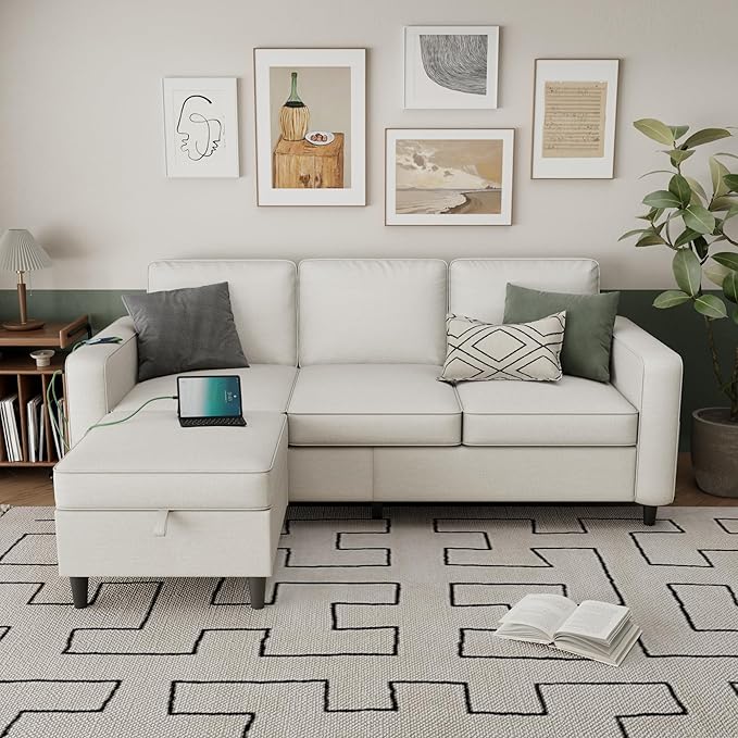 Sectional Sofa Couches for Living Room - 78'' Beige 3 Seat L-Shaped Couch with Type-C Charging Port & Storage Ottoman, Modern Linen Convertible Sectionals Sofas with Chaise for Apartment