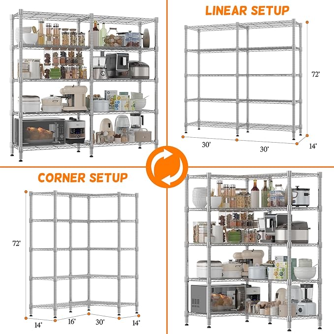 - 【ADJUSTABLE SHELVES】Customize shelf heights to fit various item sizes. Install the unit in either a straight-line configuration or a space-saving corner setup, offering flexibility to suit any room layout. Perfect for maximizing storage in both open and tight spaces