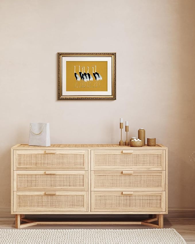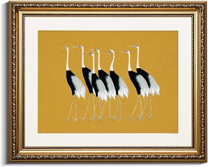 VIYYIEA Gold Framed Wall Art Canvas Print Home Decor, Vintage Cranes Wall Art for Living Room, Vintage Animal Oil Painting Picture, Print Framed Home Decor, Bathroom Wall Decor Seven Cranes 13x16in