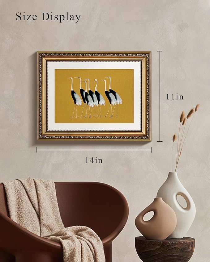 VIYYIEA Gold Framed Wall Art Canvas Print Home Decor, Vintage Cranes Wall Art for Living Room, Vintage Animal Oil Painting Picture, Print Framed Home Decor, Bathroom Wall Decor Seven Cranes 11x14in