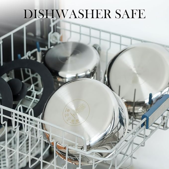 - TRI-PLY CLAD DESIGN: This stainless steel cookware features a 3-layer construction combining 430 stainless steel, aluminum, and 18/10 (304) stainless steel. The aluminum core is securely sealed within the stainless steel layers, preventing leaching while utilizing aluminum's superior heat conductivity for an evenly heated cooking surface.