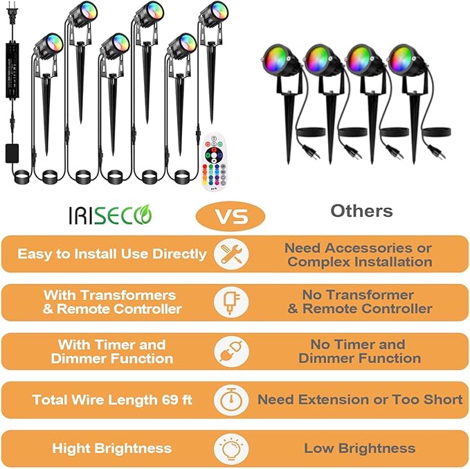 - 【Integrated LED Landscape Lighting Technology】-IRISECO color changing spotlight outdoor due to advanced high-quality LED chips provide RGBW glow, stable light source without flickering, higher brightness, lower energy consumption, and up to 50,000H of life. 330° adjustable head allows you to focus the light wherever you need it,perfect for illuminating your yard garden house backyard fences.