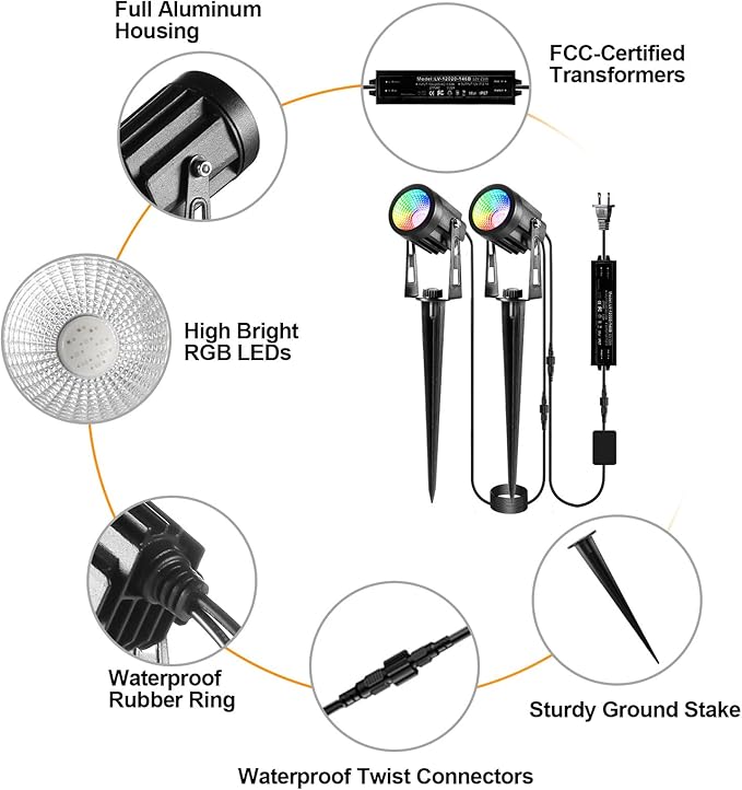 - 【IP65 Waterproof & Safe Low Voltage】-Plug in spotlights outdoor with fully sealed design IP65 waterproof, all-aluminum body to withstand a variety of extreme outdoor weather conditions. Equipped with transformer certified by FCC (100-240V AC Input , 12-36V DC Output), compatible with low-voltage lighting systems, safer and more energy-efficient than traditional high-voltage lighting.