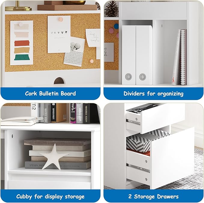 - 【Ample Storage Space】: This kids' study desk features top shelf and storage box for display decors, 2 compartments designed to organize books, documents, and other school supplies. The bulletin board surface allows kids to pin up pictures, drawings, and important notes. Additionally, 2 drawers holds personal belongings for privacy.
