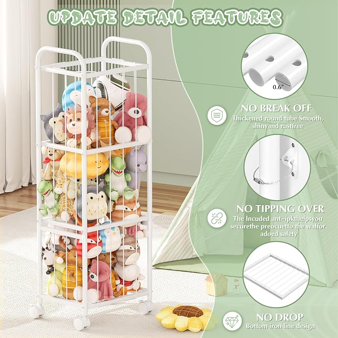 - Smart 2-in-1(360° Wheels& Wall anchorage) Ultimate mobility! Plushies Storage Glide it effortlessly on 4 smooth-rolling casters (2 lock for safety) to any play zone – bedroom, playroom, living room. For added peace of mind, our Rotating Toy Storage Tower includes a wall anchorage to secure the organizer and prevent tipping