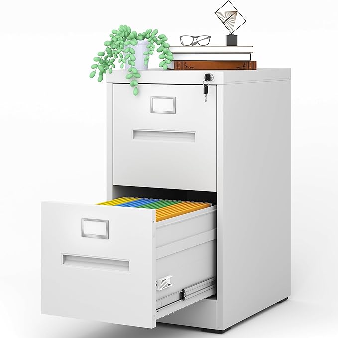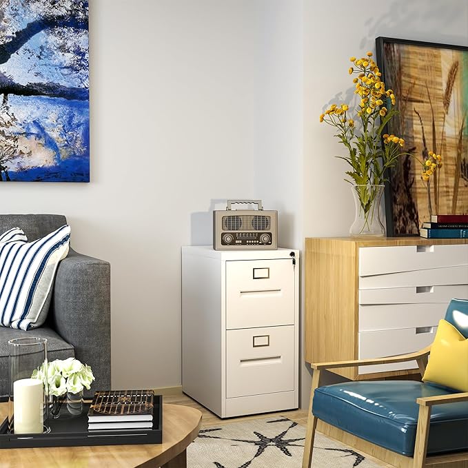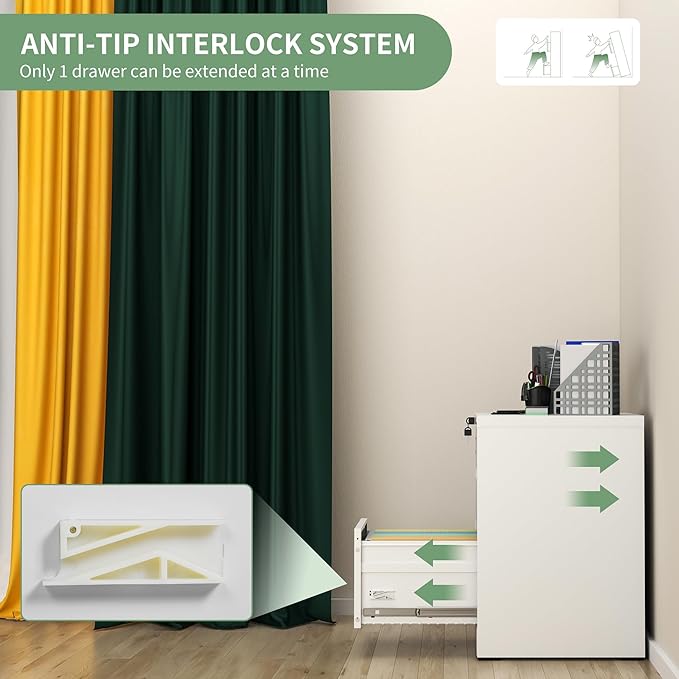 - 【Reliable Locking System】All the drawers of file cabinet can be locked by one lock, when one drawer of the metal file cabinet is opened, the anti-tilt and interlocking system prevents the other drawer from opening, ensuring your safety.