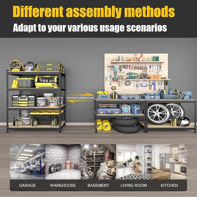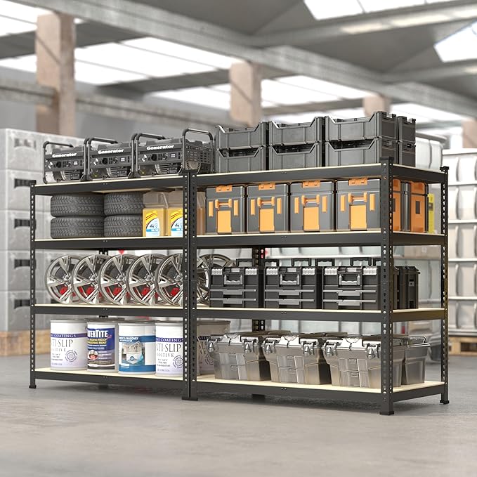 - 【 Heavy Duty & Long-lasting】This 4-tier garage shelving is made of high-quality thicker MDF boards and 0.03" thicker heavy duty galvanized metal frame, sturdy and ensuring. The metal frame is covered with premium powder coating to give it a smooth surface. Each shelf holds up to 400 lbs, 4 tier shelves' total max load weight is 1600 lbs
