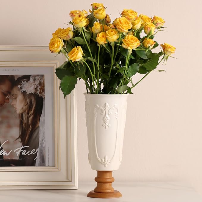 hjn White Cermaic Vase for Flowers Vintage Vase with Wooden Base for Your Home Decor/Table/Kitchen/Office/Living Room-White (French Flower Pattern)