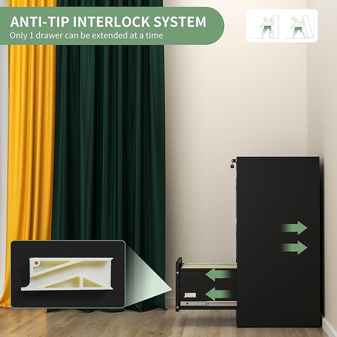 - 【Reliable Locking System】All the drawers of file cabinet can be locked by one lock, when one drawer of the metal file cabinet is opened, the anti-tilt and interlocking system prevents the other drawer from opening, ensuring your safety.