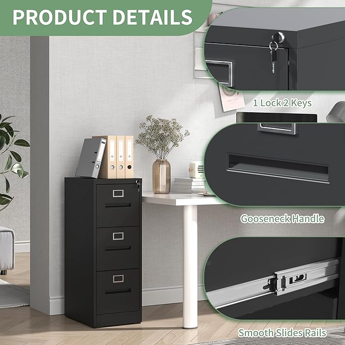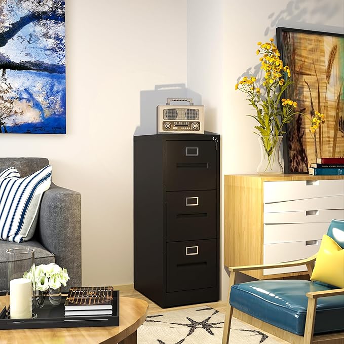- 【Multifunctional use】This black filing cabinet suits for home office and personal use, the vertical file cabinet does not take up too much space. You can use the file cabinet organizer in the office or your home and also use the lockable file cabinet as a personal belongings storage cabinet to store your letters and documents, etc.