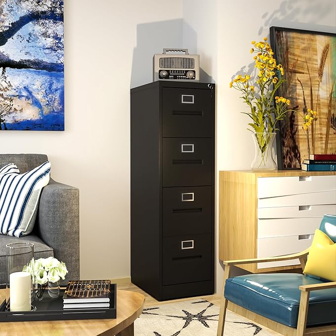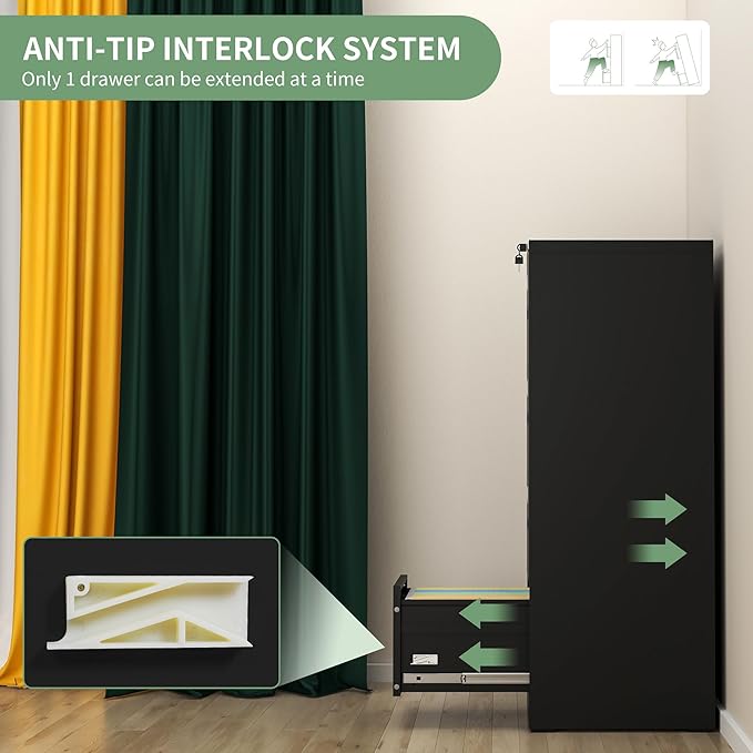 - ◉【Lockable & Secure】The black 4 drawer filing cabinet features a locking mechanism with interlock systems that secure all drawers simultaneously, enhancing the security of your documents. The anti-tilt system prevents tipping when multiple drawers are open, ensuring your safety.