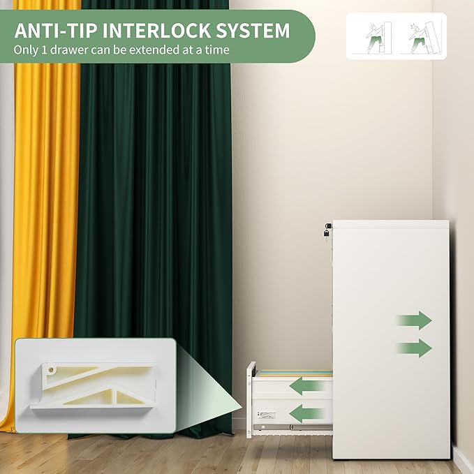 - 【Reliable Locking System】All the drawers of file cabinet can be locked by one lock, when one drawer of the metal file cabinet is opened, the anti-tilt and interlocking system prevents the other drawer from opening, ensuring your safety.