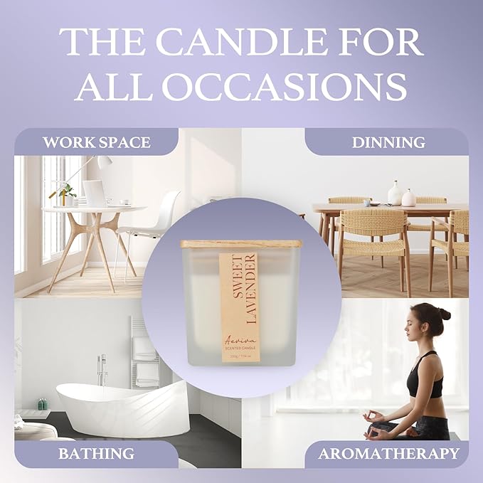 - Lavender Scented Candle: Unwind with the classic soothing scent of sweet lavender, a blend of fresh lavender blooms softened by a hint of sweetness. With each burn, feel the day’s stresses melt away as you sink into serenity