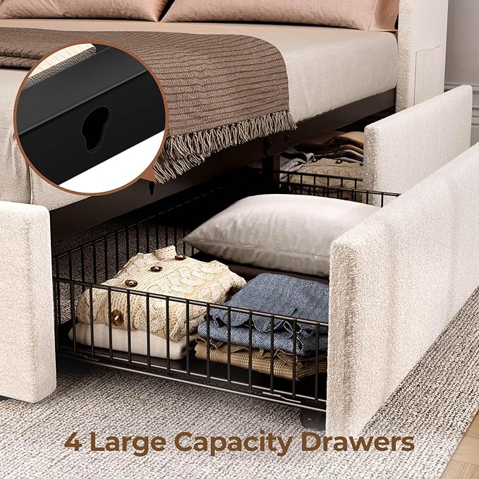 - Special Feature : Fluffy Boucle Fabric, Lighted, No Box Spring Needed, Sliding Drawers, USB Port