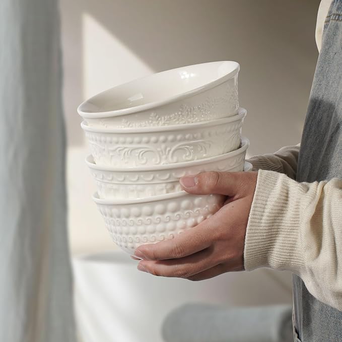 Cereal Bowls Set of 4 - Ceramic Soup Bowls for Kitchen 30 Oz Embossment White Breakfast Bowls for Rice, Pasta, Fruits, Salad, Ramen, 6.25 Inch, Dishwasher & Microwave Safe (Multiple Patterns)