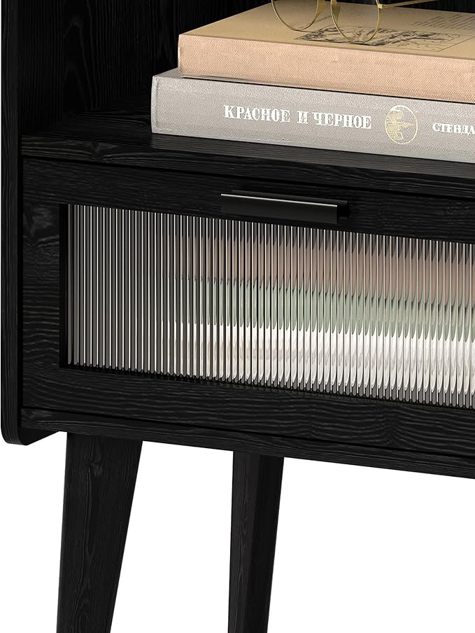 - Nightstand with MORU Glass Door : MORU Glass is a patterned glass with uneven vertical lines, which transmits light but does not see through. It protects your privacy, brings a hazy beauty. It combines modern and mid century element makes the room look more stylish