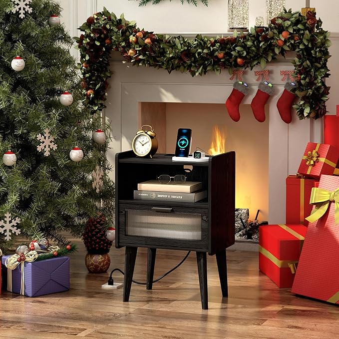 Nightstand with Charging Station, Bedside Tables with Glass Decorative Door, Black Wood Grain End Table, Side Table with 2 Tiers Storage Space for Bedroom Living Room CAMLBZ07XE