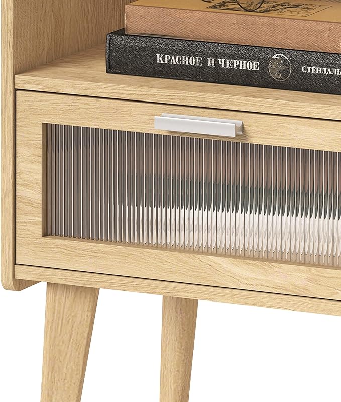 - Nightstand with MORU Glass Door : MORU Glass is a patterned glass with uneven vertical lines, which transmits light but does not see through. It protects your privacy, brings a hazy beauty. It combines modern and mid century element makes the room look more stylish