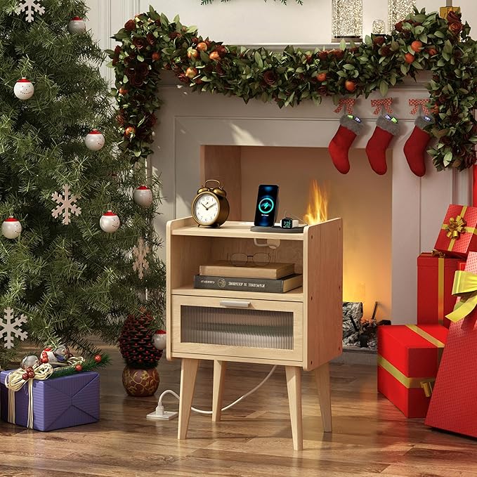 Nightstand with Charging Station, Bedside Tables with Glass Decorative Door, Natural End Table, Side Table with 2 Tiers Storage Space for Bedroom Living Room CAMLBZ07YE