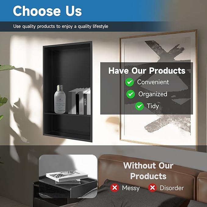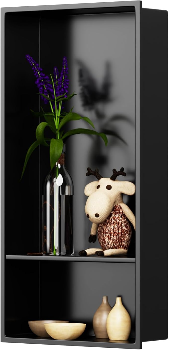 - STYLISH AND MODERN FINISH: This bathroom shower niche features a matte black finish, adding a modern touch to your bathroom decor. The clean, polished design complements a variety of bathroom styles, whether modern or traditional, and serves as a decorative element in the shower area while also being functional