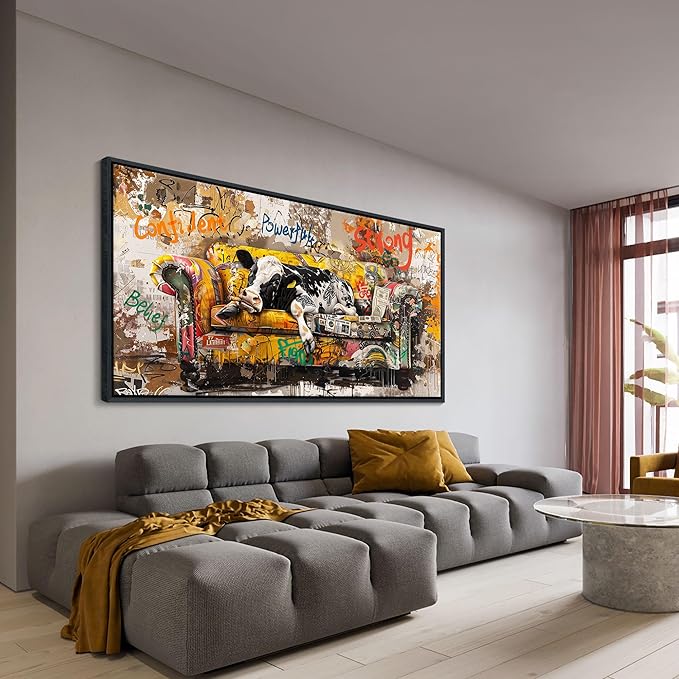 JEAWA Framed Canvas Wall Art - Large Creative Wall Art for Bedroom Living Room Bathroom, Modern Artwork Decor for Home Decoration, Funny Cow Color Graffiti, 29x58 IN