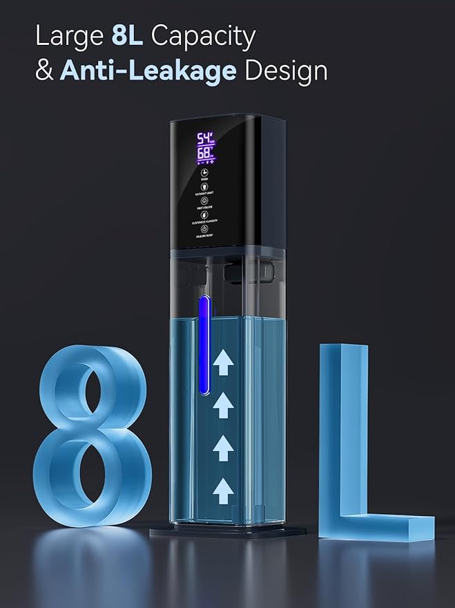 - 【8L Large Capacity & Powerful Mist!】If you are bothered by problems associated with dry air—dry sinuses, nosebleeds, cracked and sore lips, —the air in your home is likely under-humidified.Our high-capacity humidifier is here to provide you with the ultimate solution. With a large 8L (2.11gal) water tank, it can continuously produce a powerful mist output of 300ml/h for up to 48 hours on a single refill. Its sleek, slim design allow for easy placement in any room without taking up too much space