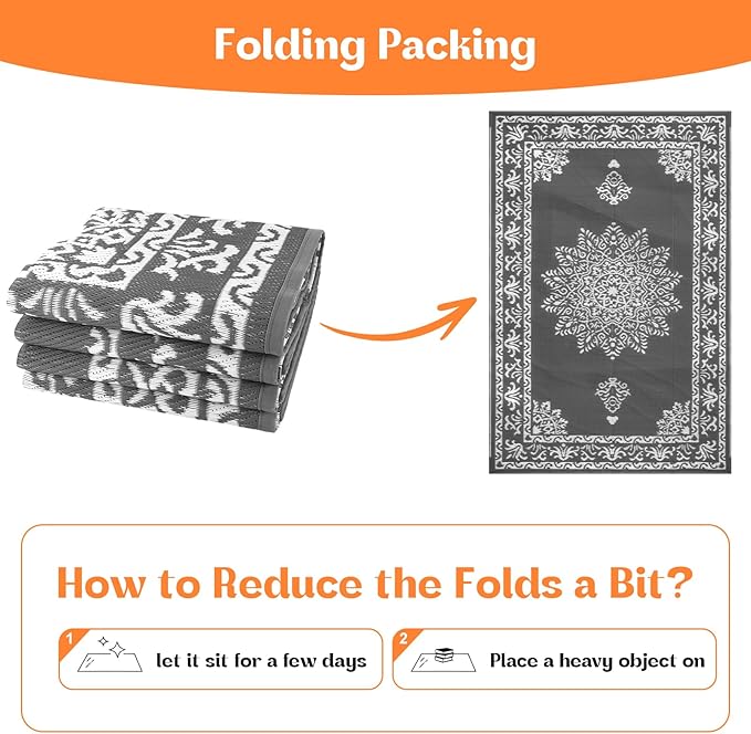- 【Portable & Easy to Store】The lightweight foldable ourdoor rug package include carrying storage bag and 4 corner loops with 4 stakes to help fix the carpet in place. Easy to carry and space saving. Perfect camper must haves outdoor rug for camping, gatherings and RV trips.