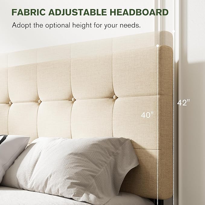 - 【Adjustable Headboard】This upholstered platform bed features an adjustable headboard with two different height settings to accommodate mattresses of various thicknesses. The soft upholstery offers enhanced comfort and relaxation.