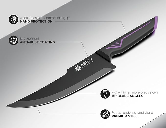 - Eye-Catching Kitchen Knife Set: With its vibrant black and purple design, this knife set brings a pop of color and a bold, modern touch to any kitchen decor. Presented in a sleek, gift-ready box, it's ideal for housewarmings, wedding,Christmas, or any special occasion