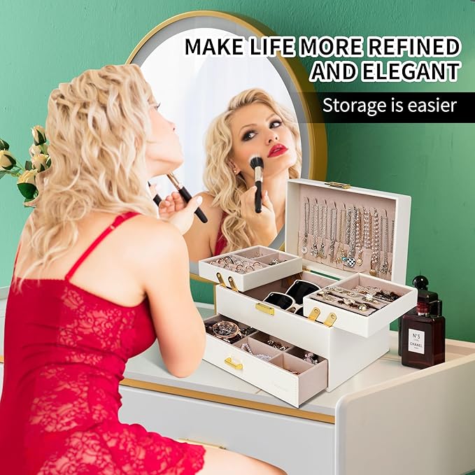 Dajasan Jewelry Box for Women, 3 Layers Large Jewelry Organizer Box, Jewelry Storage Case for Earring, Ring, Necklace, Bracelets (Cloud White + Gold)