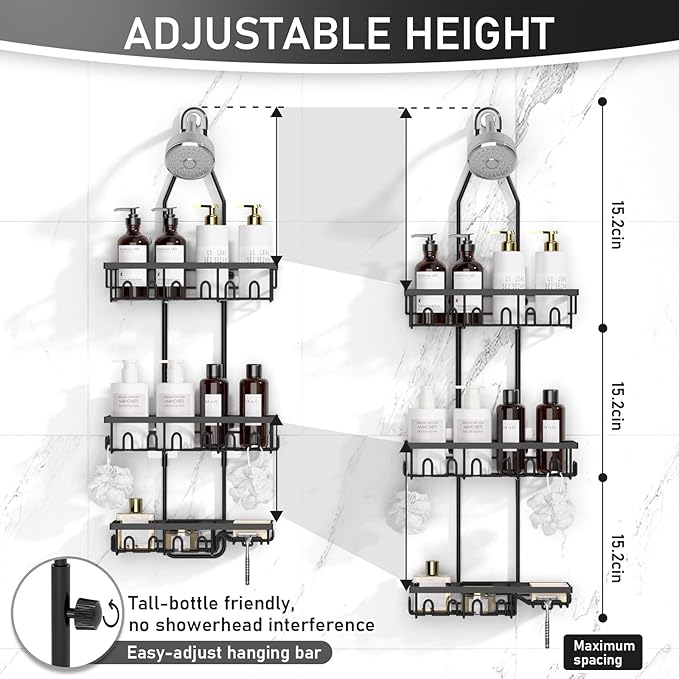 - Adjustable Length - Shower shelf with upgraded adjustable extension structure, you can adjust the height of the shelf according to your needs, which provides enough space for large-capacity toiletries. It prevents water bottles from hitting the shower head and makes it easier to fully utilize the space.