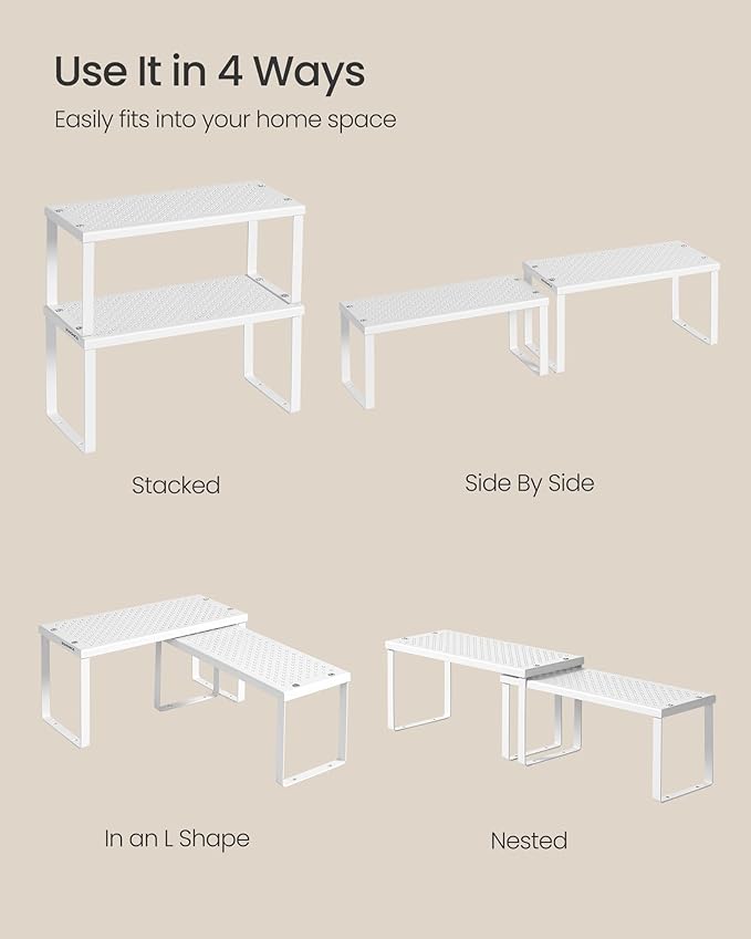SONGMICS Spice Racks, Set of 2 Metal Cabinet Shelf Organizers, Countertop Organizers, Shelf Risers, Stackable, Expandable, White UKCS003W01