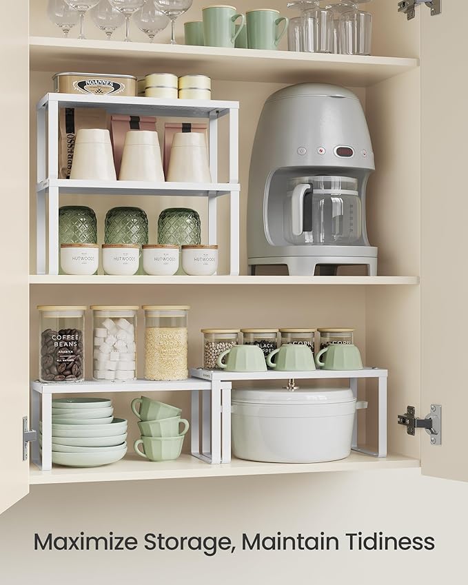 - [Maximize Your Storage] If you have a large cupboard but your items still have nowhere to go, try this set of 2 cabinet organizers—it takes full use of the vertical space and doubles your storage space
